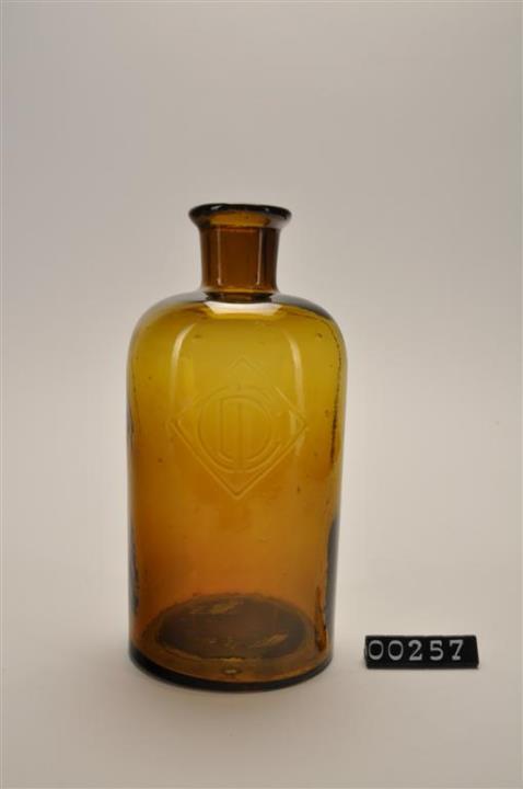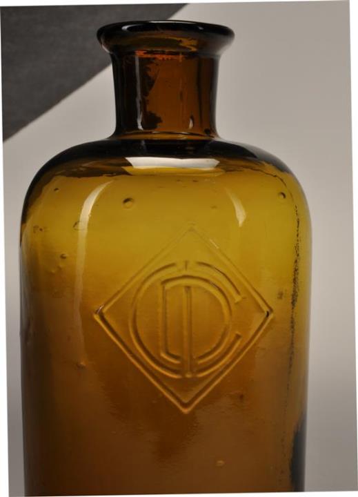 Brauner, runder Flaschenkörper mit abfallender Schulter. Ausgebogener, manuell nachgearbeiteter Mündungsrand. Mit Prägung an der Wand (DIC).