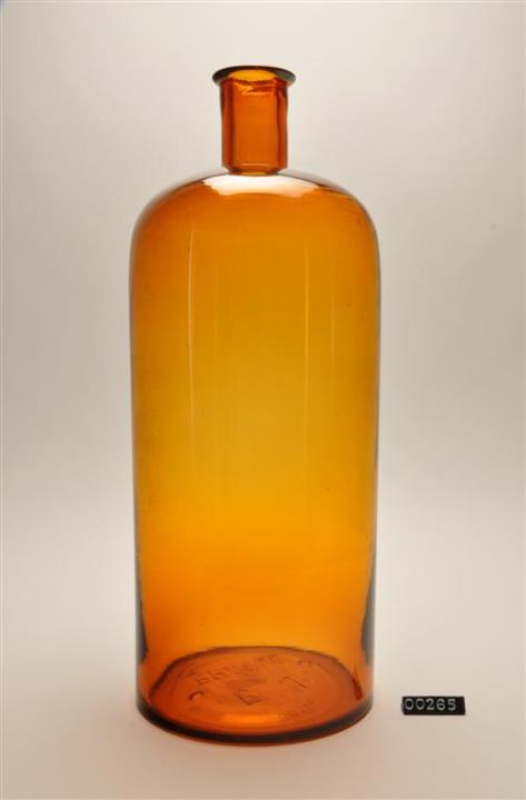 Hellbrauner, runder Flaschenkörper, maschinell hergestellt, unregelmäßig ausgebogener, leicht verdickter Mündungsrand, runde Schulter leicht nach innen gewölbter Boden. Mit Prägung.