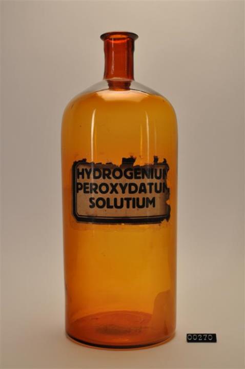 Runde Enghalsflasche ohne Korkstopfen. Unregelmäßig ausgebogener, leicht verdickter Mündungsrand. Signiert. Braunes Glas. Enthielt Wasserstofferoxid.