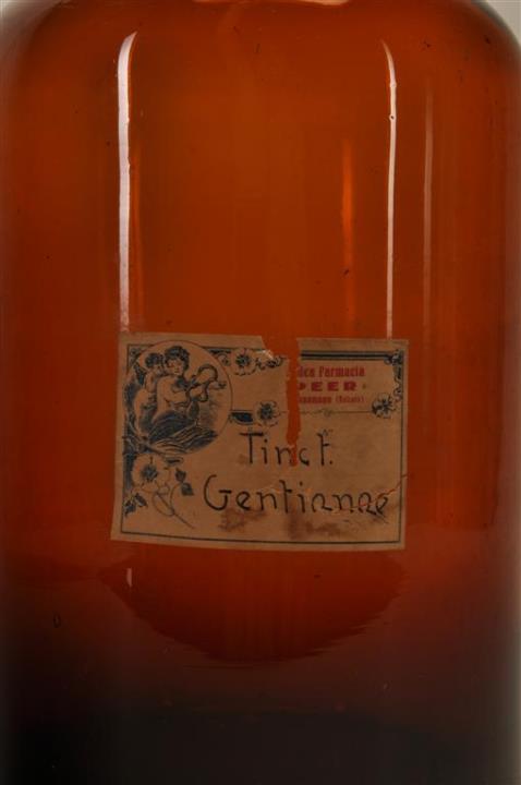 Runde Enghalsflasche mit Korkstopfen. Unregelmäßig ausgebogener, verdickter Mündungsrand. Etikettiert. Signiert von Toni Kerer. Braunes Glas. Enthielt Enziantinktur.