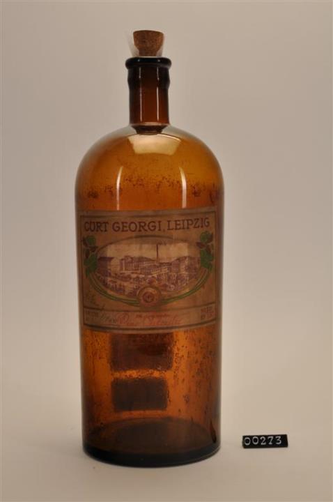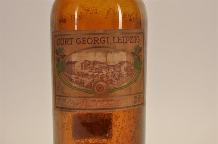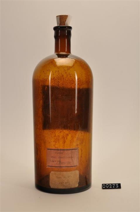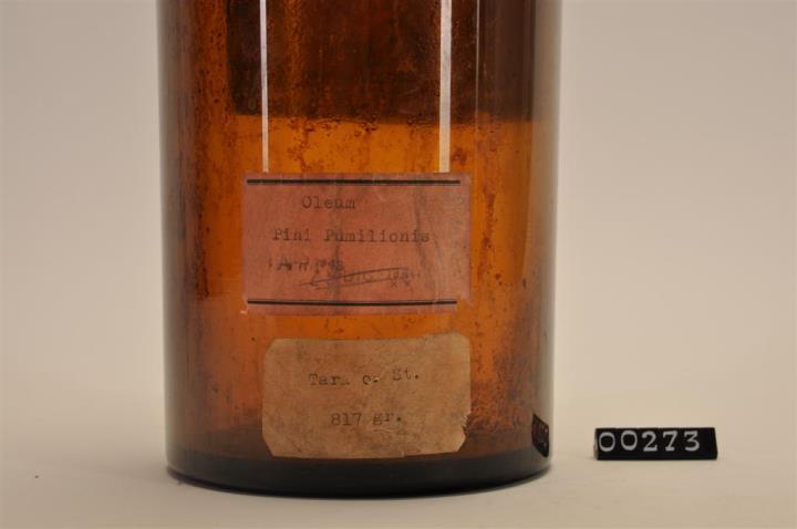 Runde Enghalsflasche mit Korkstopfen, verdickter Mündungsrand. Etikettiert. Braunes Glas. Rückseite rotes maschinenbeschriebenes Schild mit Oleum Pumilionis - Latschenkiefernöl.