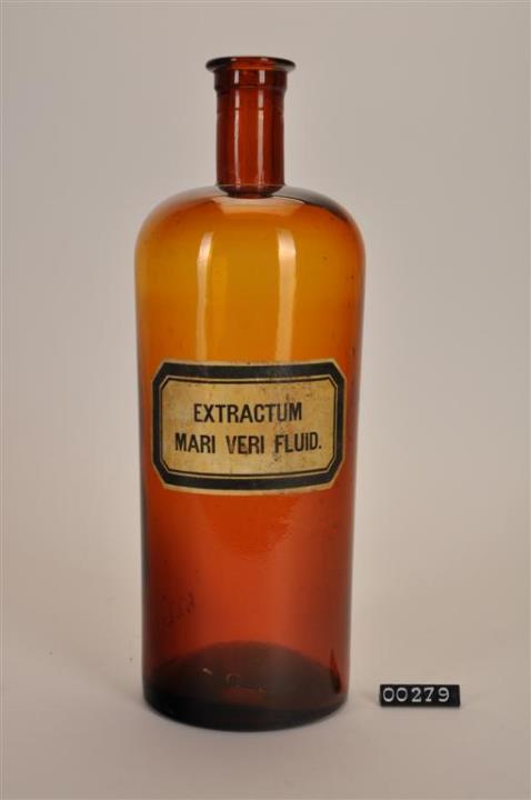 Runde, braune Enghalsflasche ohne Korkstopfen. Maschinell hergestellt, manuell nachgearbeiteter Rand. Signiert. Enthielt einen Fluidextrakt vom Katzengmanderkraut.