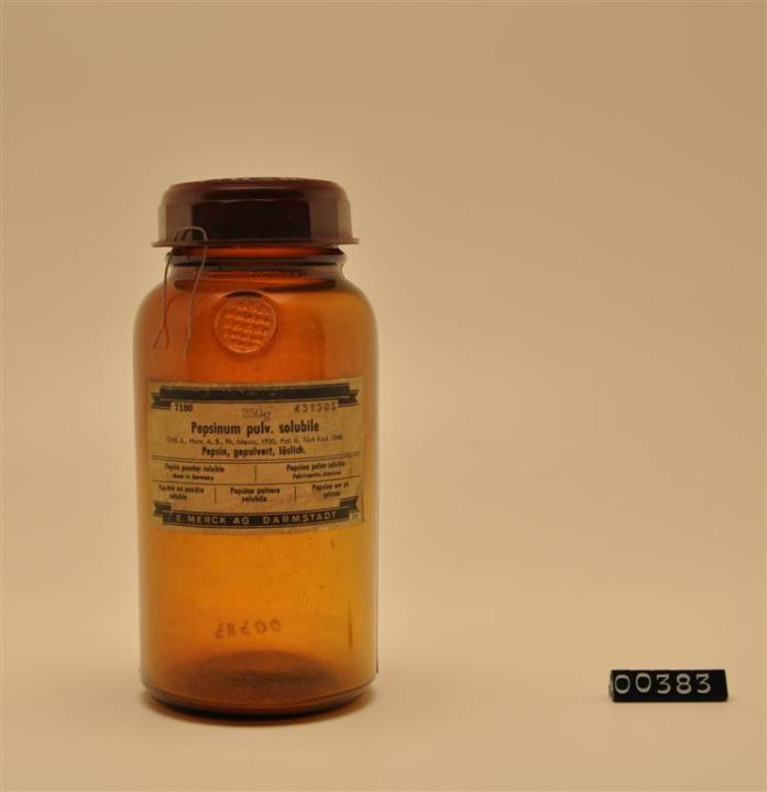 Brauner, zylindrischer Glaskörper, abfallende Schulter, weite Mündung für Schraubverschluss. Vieleckiger, runder Schraubdeckel aus weinrotem Bakelit mit Öse für Siegelfaden Etikett der Firma Merck.
