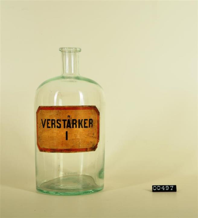 Runde Enghalsflasche ohne Stopfen aus farblosem Glas mit leichtem Grünstich. Formglas mit manuell aufgesetztem Hals und aufgelegtem Halsfaden mit abgeflachtem Profil. Signiert.