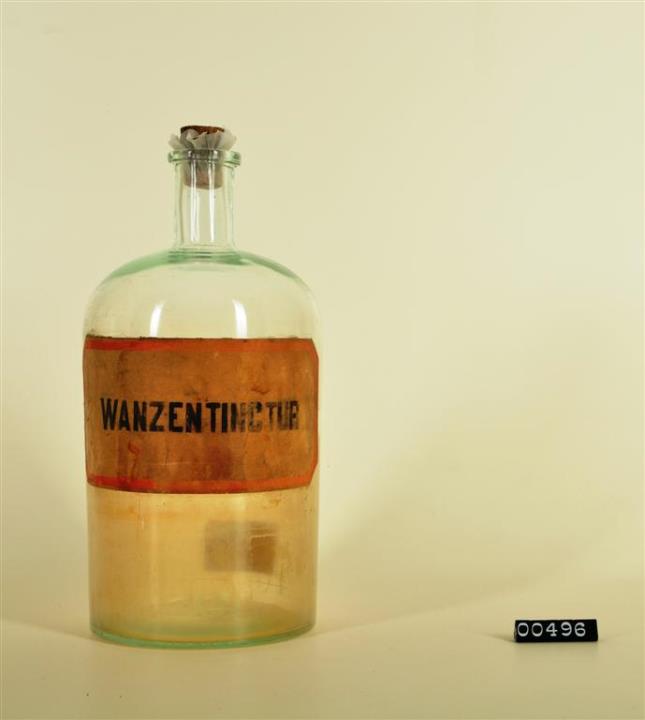 Runde Enghalsflasche mit Stopfen aus farblosem Glas mit leichtem Grünstich. Formglas mit manuell aufgesetztem Hals und aufgelegtem Halsfaden mit abgeflachtem Profil. Signiert.