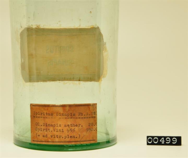 Runde, hellgrüne Enghalsflasche ohne Stopfen; hochgestochener Boden mit ringförmigem Hefteisenabriss; verdickte Mündung mit umgelegtem Faden. Signiert mit einem an den Ecken beschnittenem und mit Schilderlack überzogenem Papierschild mit doppeltem schwarzem Rand und schwarzer Schrift auf weißem Grund.