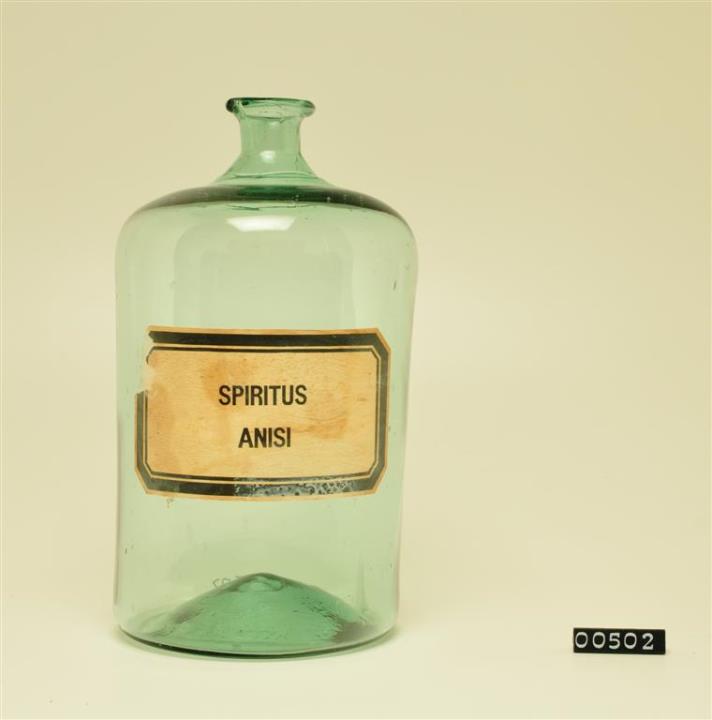 Runde, hellgrüne Enghalsflasche ohne Stopfen; hochgestochener Boden mit ringförmigem Hefteisenabriss; bis zum Halsansatz überstochen; ausgebogener, leicht verdickter Mündungsrand. Signiert mit einem an den Ecken beschnittenem und mit Schilderlack überzogenem Papierschild mit doppeltem schwarzem Rand und schwarzer Schrift auf weißem Grund.