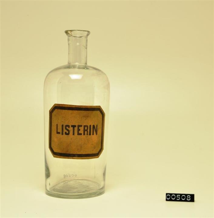Runde, farblose Enghalsflasche ohne Stopfen. Formglas mit manuell aufgesetztem Hals. Aufgelegter und ausgebogener Halsfaden mit abgeflachtem Profil. Signiert mit einem an den Ecken beschnittenem Papierschild mit schwarzem Rand und schwarzer Schrift auf weißem Grund.