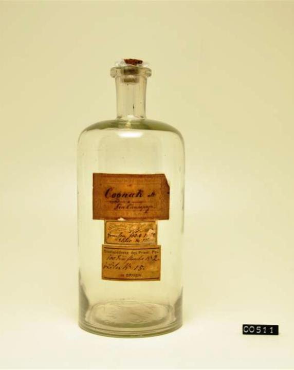 Runde, farblose Enghalsflasche mit Stopfen. Formglas mit manuell aufgesetztem Hals und aufgelegtem Halsfaden mit abgeflachtem Profil. Mit Bodenprägung. Etikettiert.