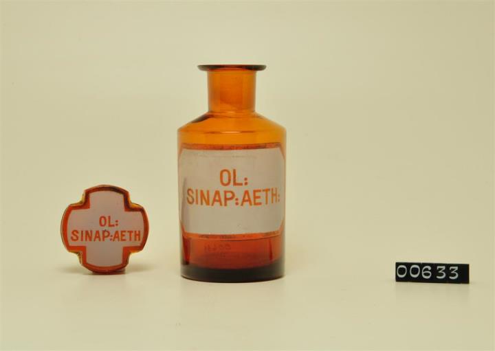 Runde, braune Enghalsflasche mit signiertem Kreuzstopfen. Verdickter, abgeflachter Mündungsrand. Achteckiges, eingebranntes Emailleschild mit einfachem roten Rand und roter Schrift auf weißem Grund. Signiert.
