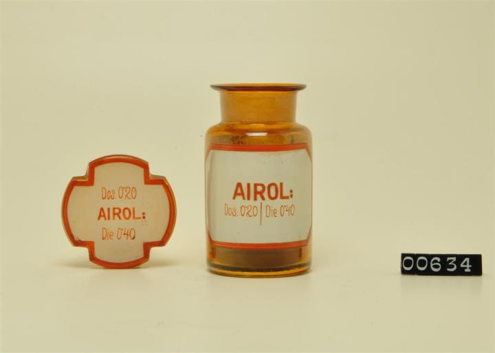 Rundes, braunes Pulverglas mit signiertem Kreuzstopfen. Ausgebogener Mündungsrand. Achteckiges, eingebranntes Emailleschild mit einfachem roten Rand und roter Schrift auf weißem Grund. Signiert.
