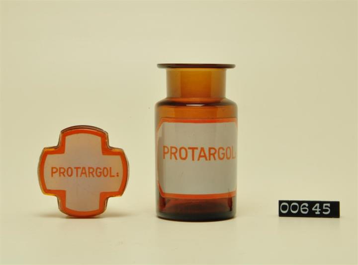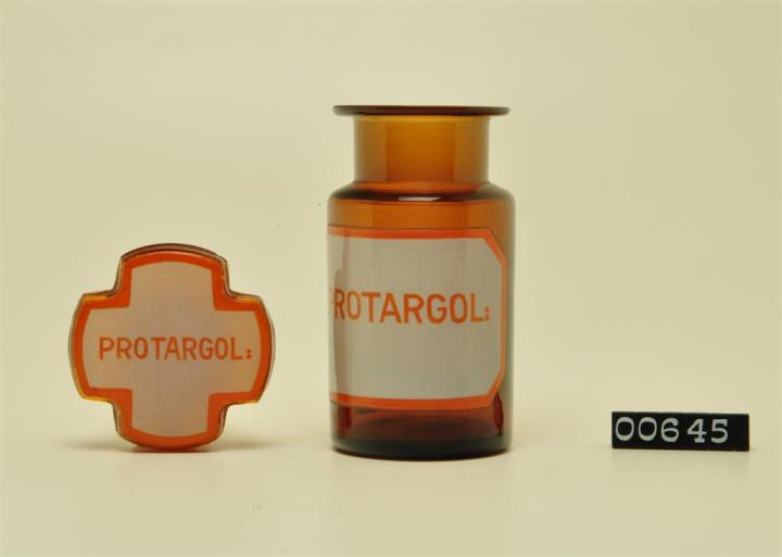 Rundes, braunes Pulverglas mit signiertem Kreuzstopfen. Abgeflachter Mündungsrand. Achteckiges, eingebranntes Emailleschild mit einfachem roten Rand und roter Schrift auf weißem Grund. Rot signiert.
