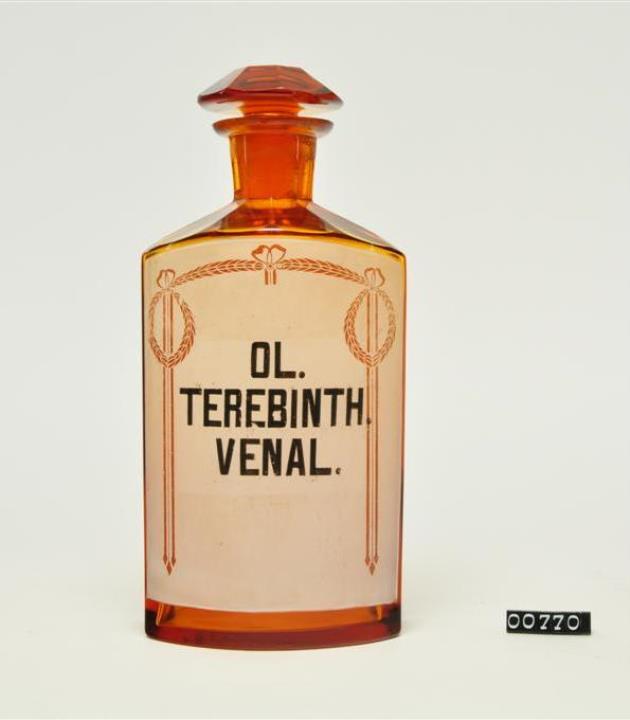Ovalgriffige, halb geschliffene Standflasche aus braunem Kristallglas. Schulter, Hals Stopfen und Boden geschliffen und poliert. Eingebranntes, weißes Emailleleschild über die gesamte Vorderwand mit jugendstilähnlicher, rotbrauner Randdekoration (Blattgirlande mit Bändern). Signiert. Enthält Terpentinöl. Venalis = Verkaufsqualität.