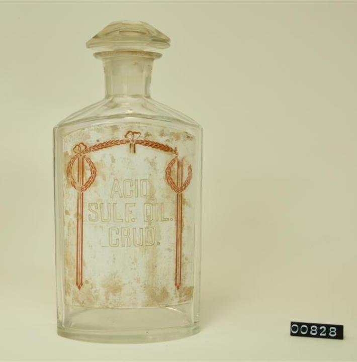 Ovalgriffige, halb geschliffene, farblose Standflasche. Schulter, Hals, Stopfen und Boden geschliffen und poliert. Eingebranntes, weißes Emailleleschild über die gesamte Vorderwand mit jugendstilähnlicher, rotbrauner Randdekoration (Blattgirlande mit Bändern). Signiert.