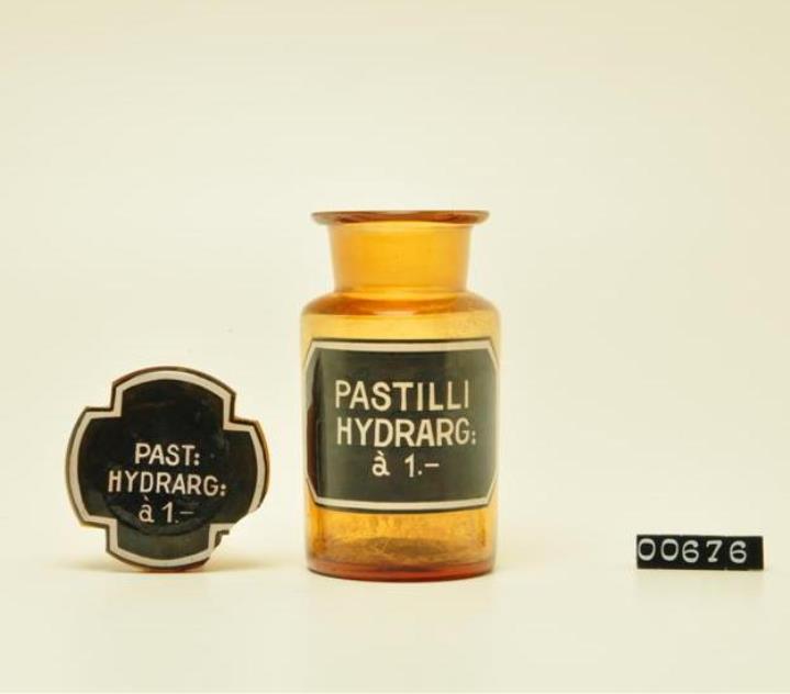 Rundes, hellbraunes Pulverglas mit signiertem Kreuzstopfen. Ausgebogener, abgeflachter Mündungsrand. Achteckiges, eingebranntes Emailleleschild mit weißem und schwarzem Rand, weißer Schrift auf schwarzem Grund. Signiert
