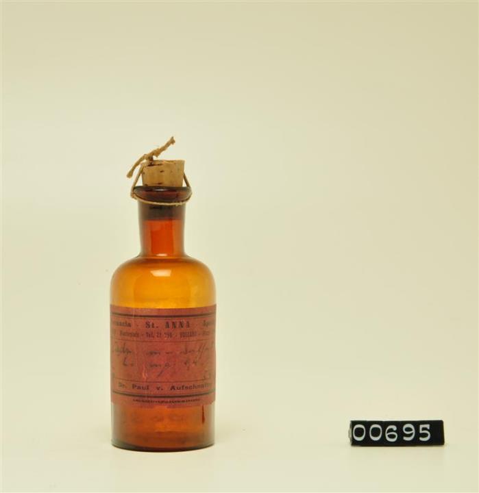 Runde, braune Enghalsflasche mit Stopfen. Maschinell hergestellt, mit aufgesetztem Flaschenhals und ausladender, abgeschrägter Mündung. Etikettiert