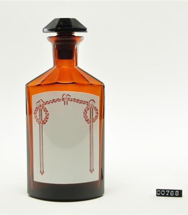 Ovale Standflasche aus braunem Glas. Hals und Schulter in Schliff-Facetten-Pressung mit eingeschliffenem Stopfen. Eingebranntes, weißes Emailleleschild über die gesamte Vorderwand mit jugendstilähnlicher, rotbrauner Randdekoration (Blattgirlande mit Bändern).