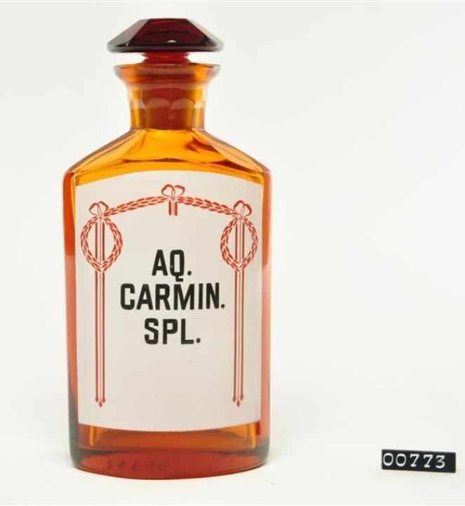Ovalgriffige, halb geschliffene Standflasche aus braunem Kristallglas. Schulter, Hals, Boden und Schliffstopfen geschliffen und poliert. Eingebranntes, weißes Emailleschild über die gesamte Vorderwand mit jugendstilähnlicher, rotbrauner Randdekoration (Blattgirlande mit Bändern). Signiert.