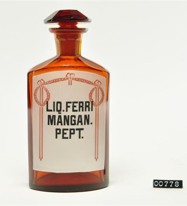 Ovalgriffige, halb geschliffene Standflasche aus braunem Kristallglas. Schulter, Hals, Boden und Schliffstopfen geschliffen und poliert. Eingebranntes, weißes Emailleschild über die gesamte Vorderwand mit jugendstilähnlicher, rotbrauner Randdekoration (Blattgirlande mit Bändern). Signiert.