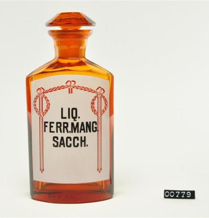Ovalgriffige, halb geschliffene Standflasche aus braunem Kristallglas. Schulter, Hals, Boden und Schliffstopfen geschliffen und poliert. Eingebranntes, weißes Emailleschild über die gesamte Vorderwand mit jugendstilähnlicher, rotbrauner Randdekoration (Blattgirlande mit Bändern). Signiert.