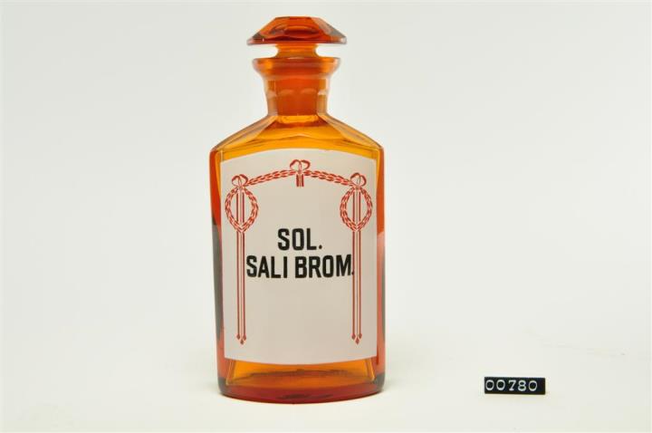 Ovalgriffige, halb geschliffene Standflasche aus braunem Kristallglas. Schulter, Hals, Boden und Schliffstopfen geschliffen und poliert. Eingebranntes, weißes Emailschild über die gesamte Vorderwand mit jugendstilähnlicher, rotbrauner Randdekoration (Blattgirlande mit Bändern). Signiert.