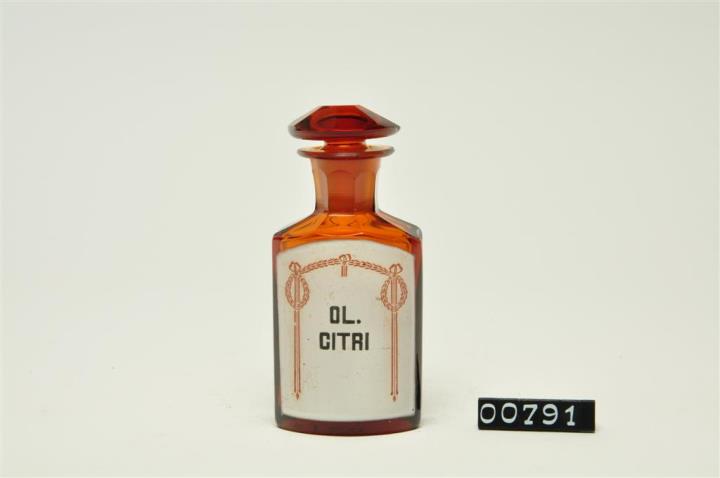 Ovalgriffige, halb geschliffene Standflasche aus braunem Kristallglas. Schulter, Hals, Boden und Stopfen geschliffen und poliert. Eingebranntes, weißes Emailleschild über die gesamte Vorderwand mit jugendstilähnlicher, rotbrauner Randdekoration (Blattgirlande mit Bändern). Signiert.