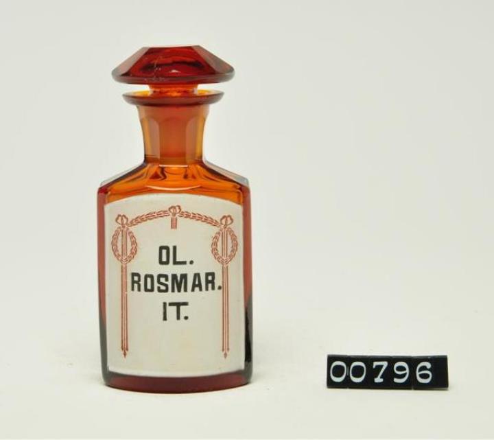 Ovalgriffige, halb geschliffene Standflasche aus braunem Kristallglas. Schulter, Hals, Boden und Stopfen geschliffen und poliert. Eingebranntes, weißes Emailleschild über die gesamte Vorderwand mit jugendstilähnlicher, rotbrauner Randdekoration (Blattgirlande mit Bändern). Signiert.