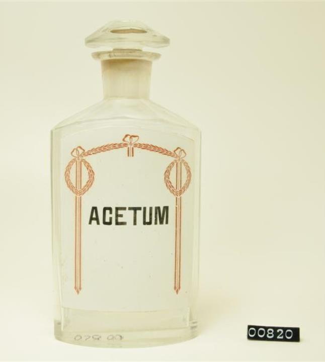 Ovalgriffige, halb geschliffene, farblose Standflasche. Schulter, Hals, Stopfen und Boden geschliffen und poliert. Eingebranntes, weißes Emailleschild über die gesamte Vorderwand mit jugendstilähnlicher, rotbrauner Randdekoration (Blattgirlande mit Bändern). Schwarz signiert.