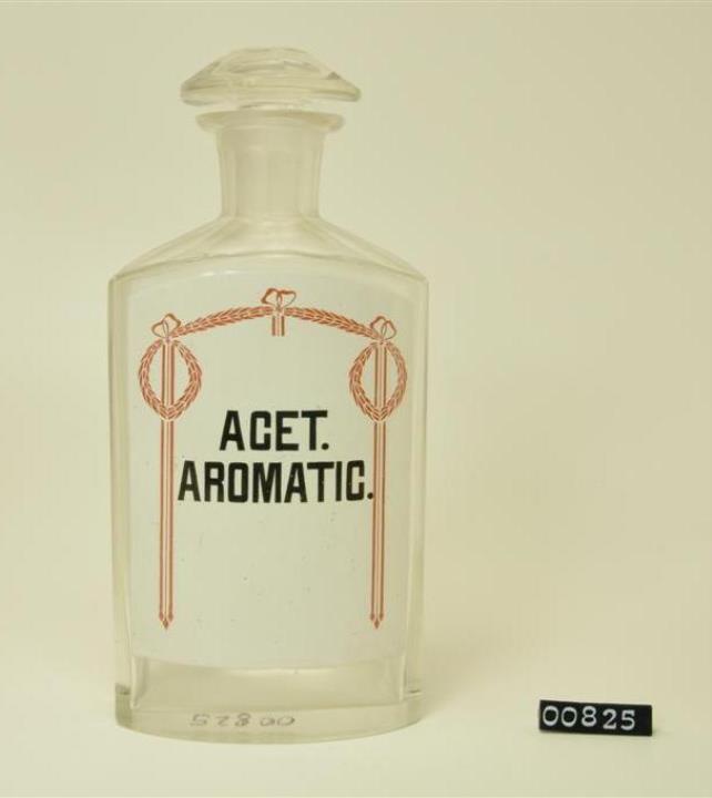 Ovalgriffige, halb geschliffene, farblose Standflasche. Schulter, Hals, Stopfen und Boden geschliffen und poliert. Eingebranntes, weißes Emailleschild über die gesamte Vorderwand mit jugendstilähnlicher, rotbrauner Randdekoration (Blattgirlande mit Bändern). Schwarz signiert.