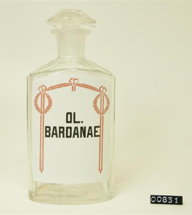 Ovalgriffige, halb geschliffene, farblose Standflasche. Schulter, Hals, Stopfen und Boden geschliffen und poliert. Eingebranntes, weißes Emailleschild über die gesamte Vorderwand mit jugendstilähnlicher, rotbrauner Randdekoration (Blattgirlande mit Bändern). Schwarz signiert.
