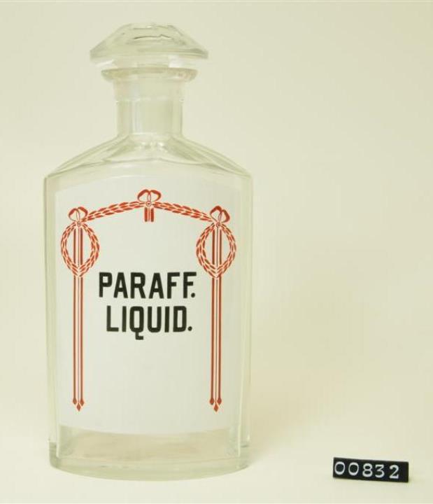 Ovalgriffige, halb geschliffene, farblose Standflasche. Schulter, Hals, Stopfen und Boden geschliffen und poliert. Eingebranntes, weißes Emailleschild über die gesamte Vorderwand mit jugendstilähnlicher, rotbrauner Randdekoration (Blattgirlande mit Bändern). Schwarz signiert.