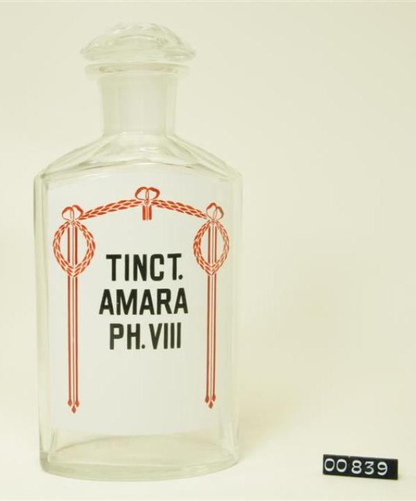 Ovalgriffige, halb geschliffene, farblose Standflasche. Schulter, Hals, Stopfen und Boden geschliffen und poliert. Eingebranntes, weißes Emailleschild über die gesamte Vorderwand mit jugendstilähnlicher, rotbrauner Randdekoration (Blattgirlande mit Bändern). Schwarz signiert.