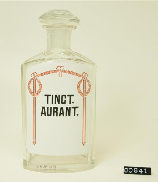Ovalgriffige, halb geschliffene, farblose Standflasche. Schulter, Hals, Stopfen und Boden geschliffen und poliert. Eingebranntes, weißes Emailleschild über die gesamte Vorderwand mit jugendstilähnlicher, rotbrauner Randdekoration (Blattgirlande mit Bändern). Schwarz signiert.