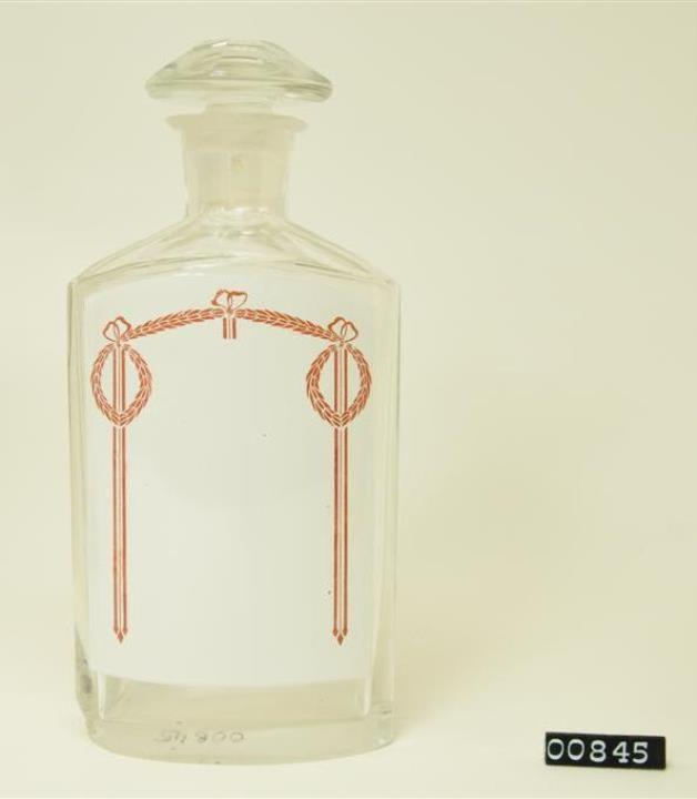 Ovalgriffige, halb geschliffene, farblose Standflasche. Schulter, Hals, Stopfen und Boden geschliffen und poliert. Eingebranntes, weißes Emailleschild über die gesamte Vorderwand mit jugendstilähnlicher, rotbrauner Randdekoration (Blattgirlande mit Bändern).