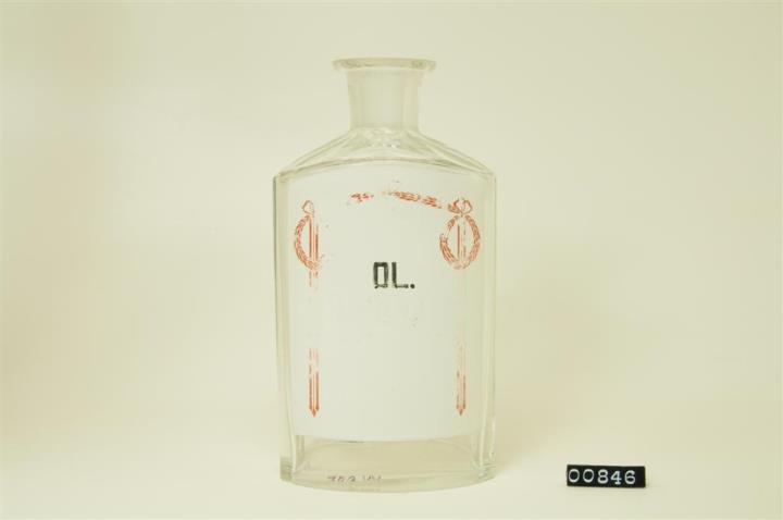 Ovalgriffige, halb geschliffene, farblose Standflasche. Schulter, Hals und Boden geschliffen und poliert. Eingebranntes, weißes Emailleschild über die gesamte Vorderwand mit jugendstilähnlicher, rotbrauner Randdekoration (Blattgirlande mit Bändern). Schwarz signiert.