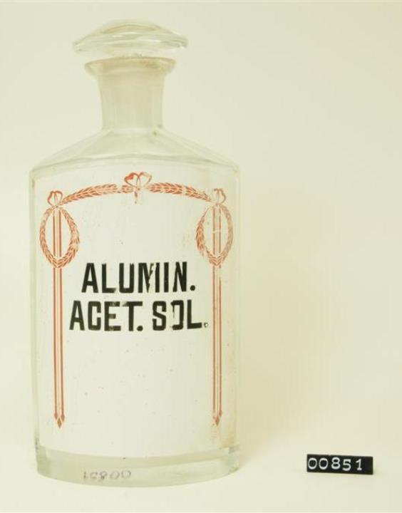 Ovalgriffige, halb geschliffene, farblose Standflasche. Schulter, Hals, Stopfen und Boden geschliffen und poliert. Eingebranntes, weißes Emailleschild über die gesamte Vorderwand mit jugendstilähnlicher, rotbrauner Randdekoration (Blattgirlande mit Bändern). Schwarz signiert.