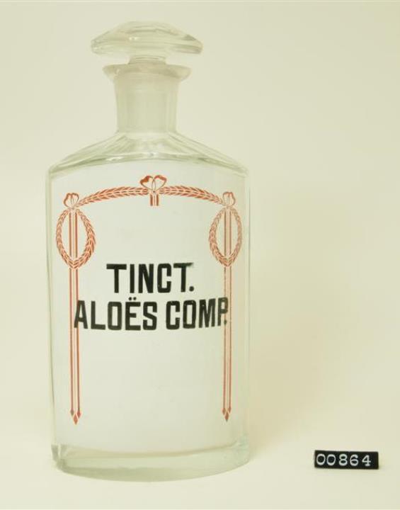 Ovalgriffige, halb geschliffene, farblose Standflasche. Schulter, Hals, Stopfen und Boden geschliffen und poliert. Eingebranntes, weißes Emailleschild über die gesamte Vorderwand mit jugendstilähnlicher, rotbrauner Randdekoration (Blattgirlande mit Bändern). Schwarz signiert.
