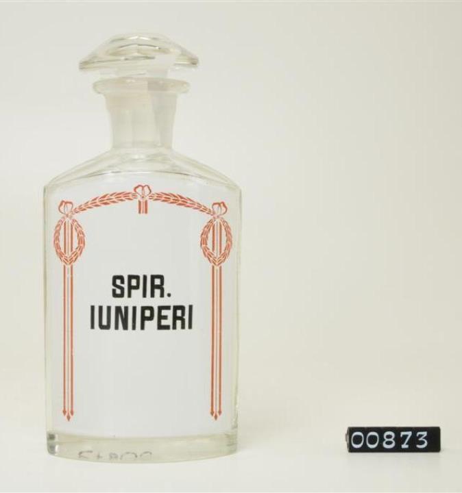 Ovalgriffige, halb geschliffene, farblose Standflasche. Schulter, Hals, Stopfen und Boden geschliffen und poliert. Eingebranntes, weißes Emailleschild über die gesamte Vorderwand mit jugendstilähnlicher, rotbrauner Randdekoration (Blattgirlande mit Bändern). Schwarz signiert.