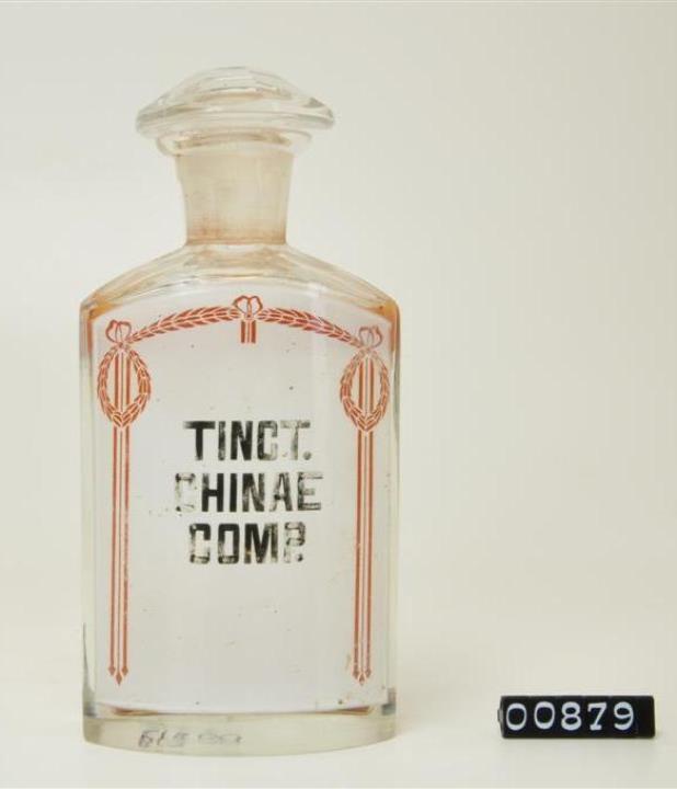 Ovalgriffige, halb geschliffene, farblose Standflasche. Schulter, Hals, Stopfen und Boden geschliffen und poliert. Eingebranntes, weißes Emailleschild über die gesamte Vorderwand mit jugendstilähnlicher, rotbrauner Randdekoration (Blattgirlande mit Bändern). Schwarz signiert.