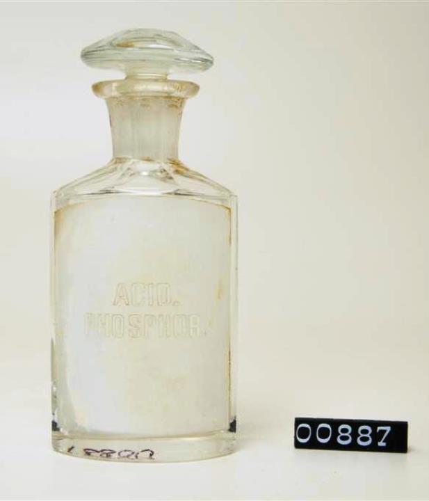 Ovalgriffige, halb geschliffene, farblose Standflasche. Schulter, Hals, Stopfen und Boden geschliffen und poliert. Eingebranntes, weißes Emailleschild über die gesamte Vorderwand mit jugendstilähnlicher, rotbrauner Randdekoration (Blattgirlande mit Bändern). Schwarz signiert.
