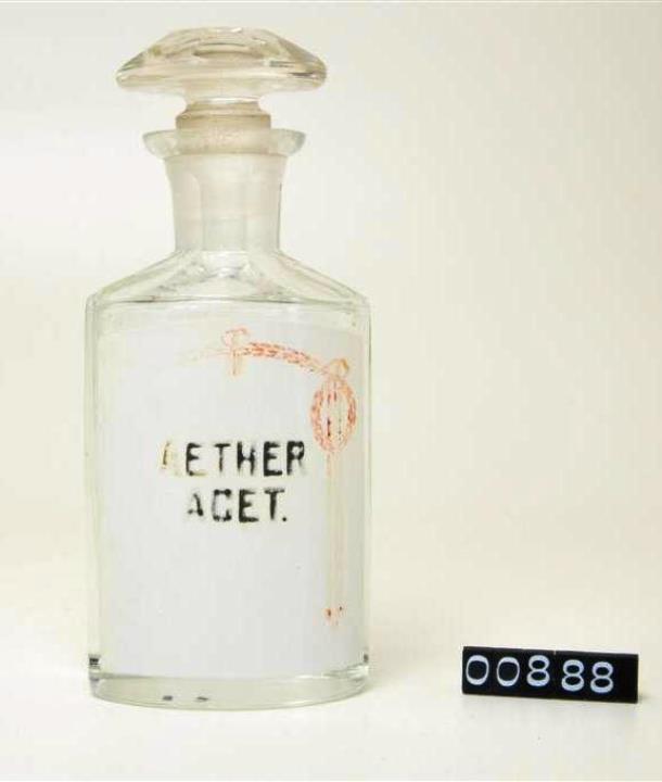 Ovalgriffige, halb geschliffene, farblose Standflasche. Schulter, Hals, Stopfen und Boden geschliffen und poliert. Eingebranntes, weißes Emailleschild über die gesamte Vorderwand mit jugendstilähnlicher, rotbrauner Randdekoration (Blattgirlande mit Bändern). Schwarz signiert.
