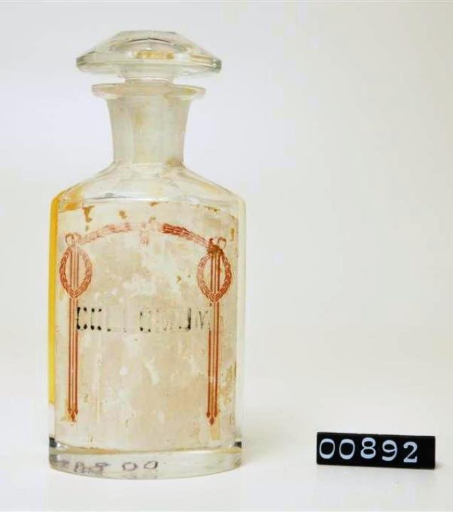 Ovalgriffige, halb geschliffene, farblose Standflasche. Schulter, Hals, Stopfen und Boden geschliffen und poliert. Eingebranntes, weißes Emailleschild über die gesamte Vorderwand mit jugendstilähnlicher, rotbrauner Randdekoration (Blattgirlande mit Bändern). Schwarz signiert.
