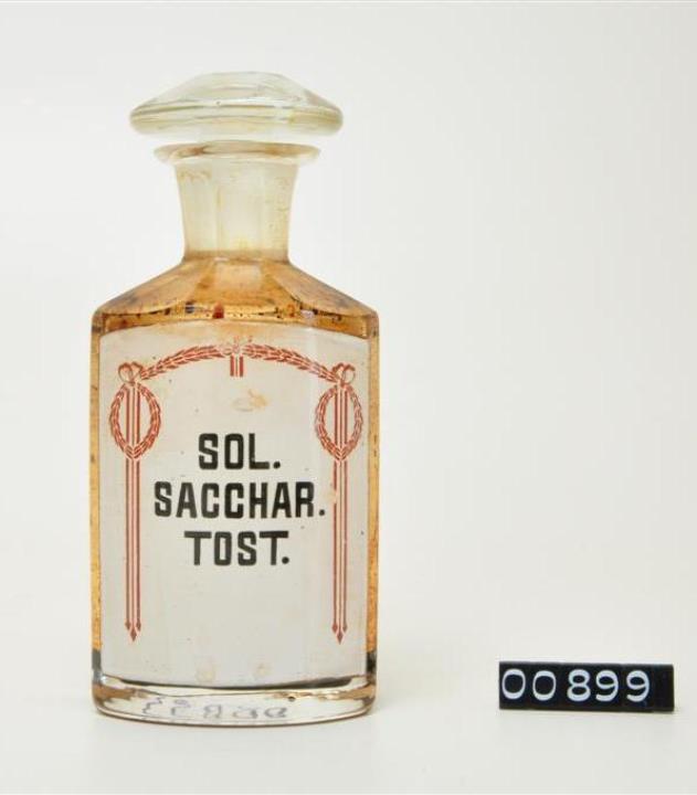 Ovalgriffige, halb geschliffene, farblose Standflasche. Schulter, Hals, Stopfen und Boden geschliffen und poliert. Eingebranntes, weißes Emailleschild über die gesamte Vorderwand mit jugendstilähnlicher, rotbrauner Randdekoration (Blattgirlande mit Bändern). Schwarz signiert.