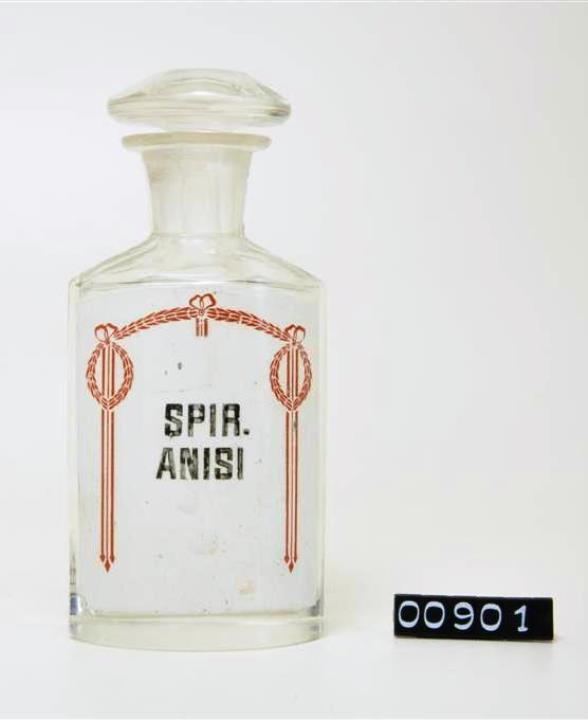 Ovalgriffige, halb geschliffene, farblose Standflasche. Schulter, Hals, Stopfen und Boden geschliffen und poliert. Eingebranntes, weißes Emailleschild über die gesamte Vorderwand mit jugendstilähnlicher, rotbrauner Randdekoration (Blattgirlande mit Bändern). Schwarz signiert.
