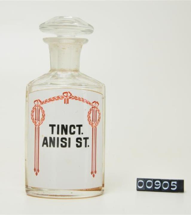 Ovalgriffige, halb geschliffene, farblose Standflasche. Schulter, Hals, Stopfen und Boden geschliffen und poliert. Eingebranntes, weißes Emailleschild über die gesamte Vorderwand mit jugendstilähnlicher, rotbrauner Randdekoration (Blattgirlande mit Bändern). Schwarz signiert.