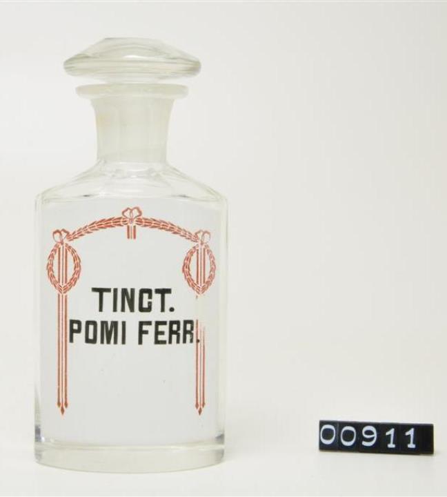 Ovalgriffige, halb geschliffene, farblose Standflasche. Schulter, Hals, Stopfen und Boden geschliffen und poliert. Eingebranntes, weißes Emailleschild über die gesamte Vorderwand mit jugendstilähnlicher, rotbrauner Randdekoration (Blattgirlande mit Bändern). Schwarz signiert.