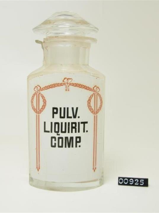 Ovalgriffiges, halb geschliffenes, farbloses Pulverglas. Schliffstopfen mit ringförmigem Hefteisenabriss. Schulter, Hals, Stopfen und Boden geschliffen und poliert. Eingebranntes, weißes Emailleschild über die gesamte Vorderwand mit jugendstilähnlicher, rotbrauner Randdekoration (Blattgirlande mit Bändern). Schwarz signiert.