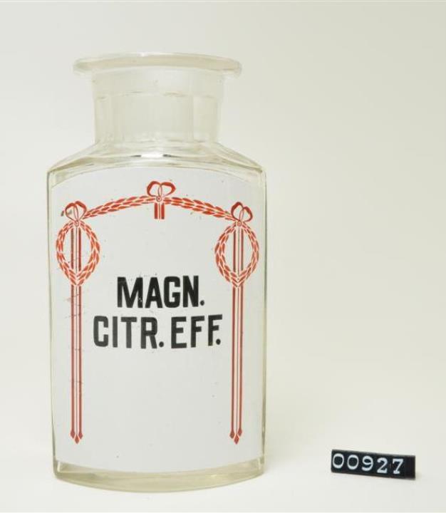Ovalgriffiges, halb geschliffenes, farbloses Pulverglas. Schulter, Hals und Boden geschliffen und poliert. Eingebranntes, weißes Emailleschild über die gesamte Vorderwand mit jugendstilähnlicher, rotbrauner Randdekoration (Blattgirlande mit Bändern). Schwarz signiert.