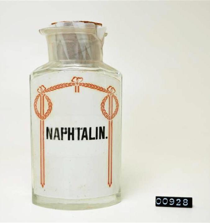 Ovalgriffiges, halb geschliffenes, farbloses Pulverglas. Schulter, Hals und Boden geschliffen und poliert. Korkstopfen. Eingebranntes, weißes Emailleschild über die gesamte Vorderwand mit jugendstilähnlicher, rotbrauner Randdekoration (Blattgirlande mit Bändern). Schwarz signiert.