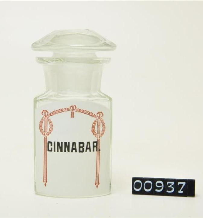 Ovalgriffiges, halb geschliffenes, farbloses Pulverglas. Schulter, Hals, Stopfen und Boden geschliffen und poliert. Eingebranntes, weißes Emailleschild über die gesamte Vorderwand mit jugendstilähnlicher, rotbrauner Randdekoration (Blattgirlande mit Bändern). Schwarz signiert.